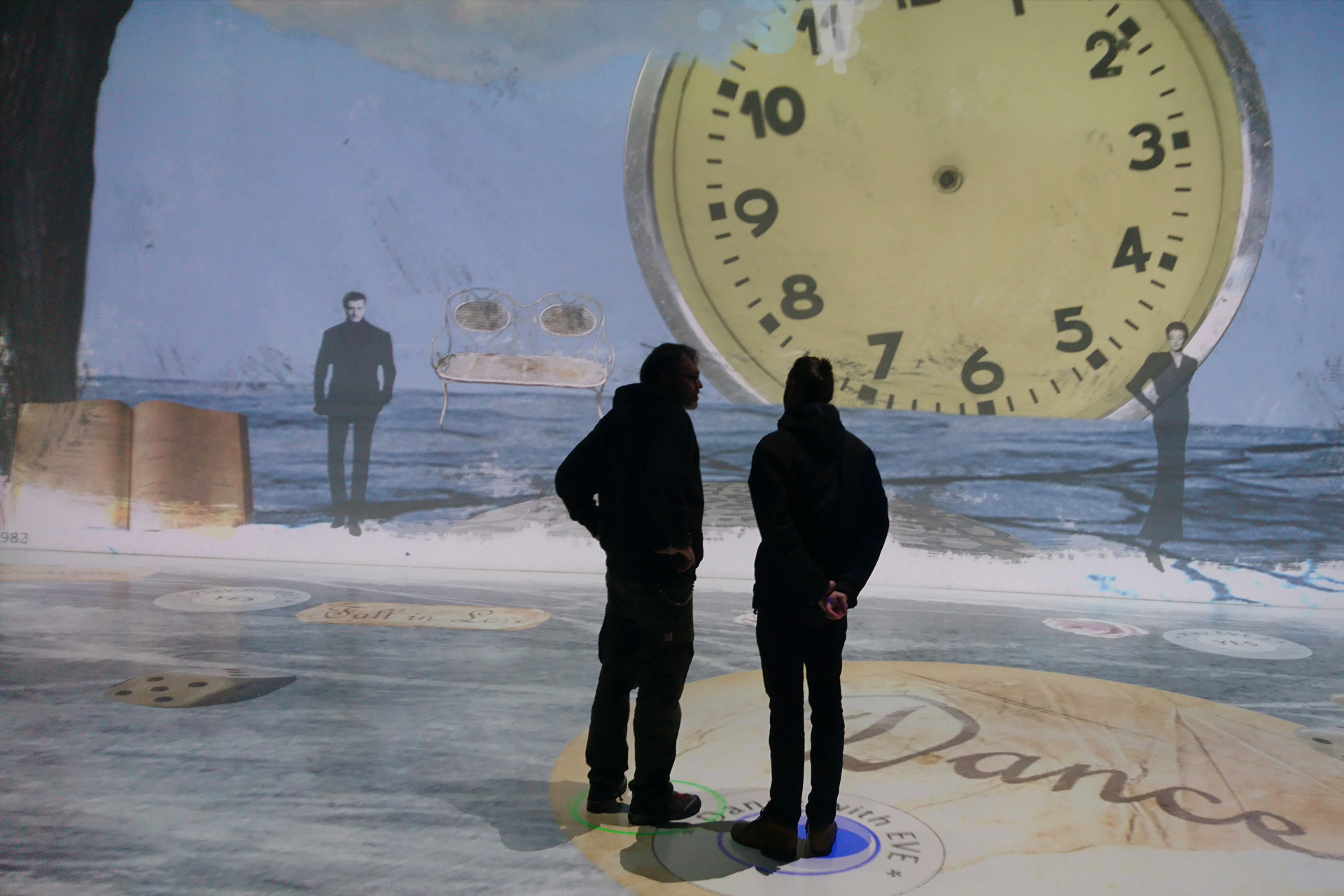 On the wall of the Deep Space, a multi-layered collage of images unfolds, along with projections of the two central characters – Eve and Pierre. Symbols and graphic surfaces are projected onto the floor, serving as interactive triggers.