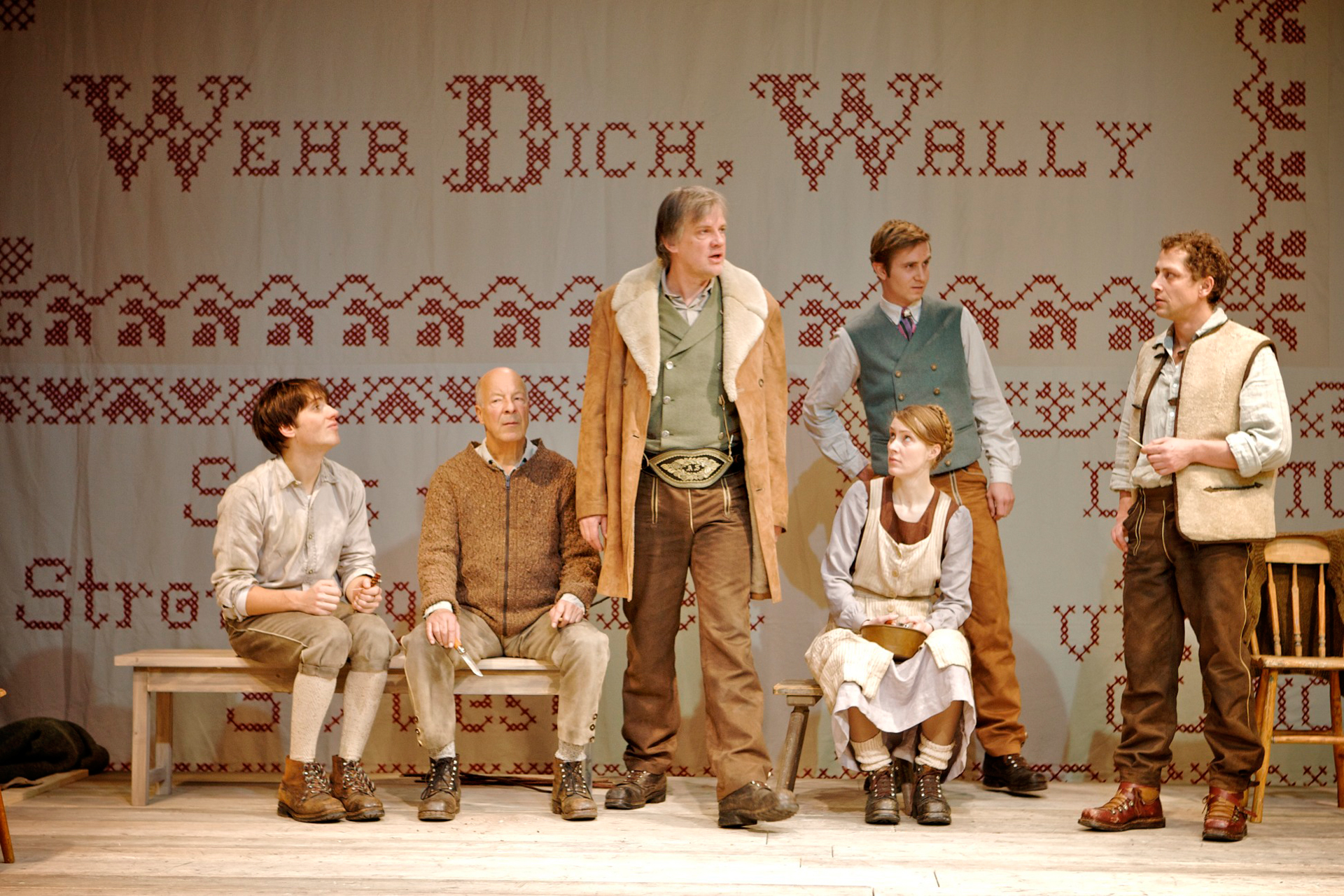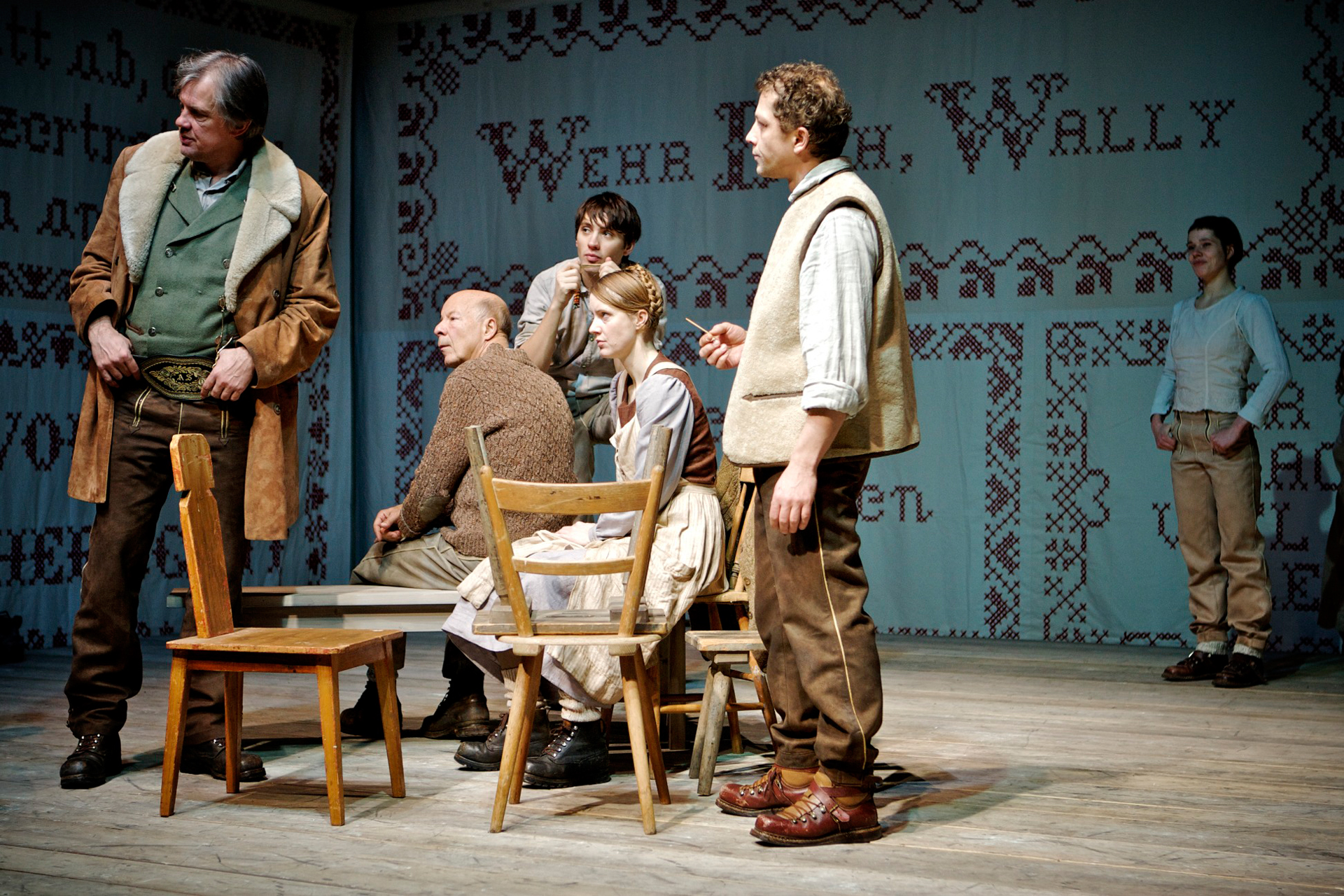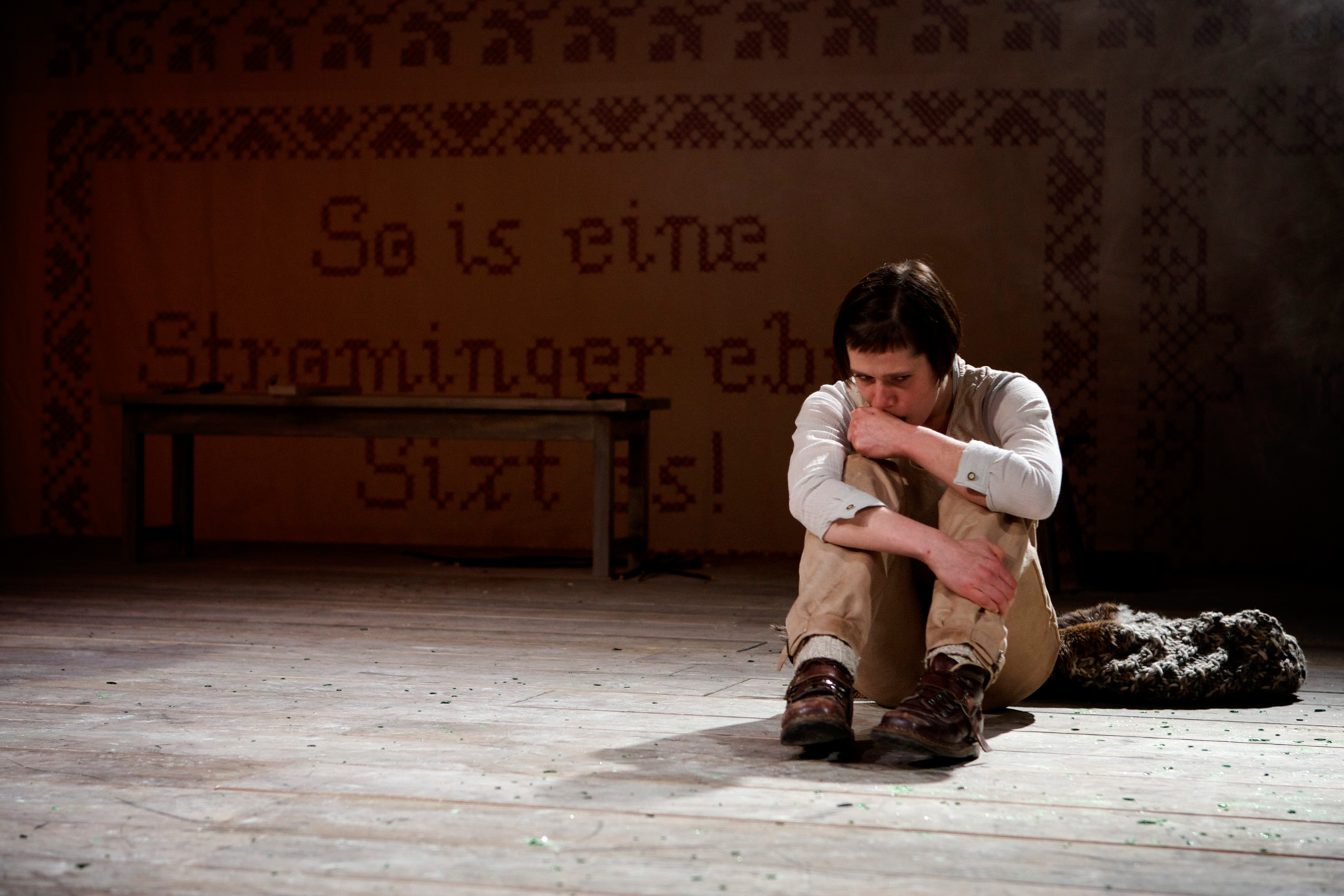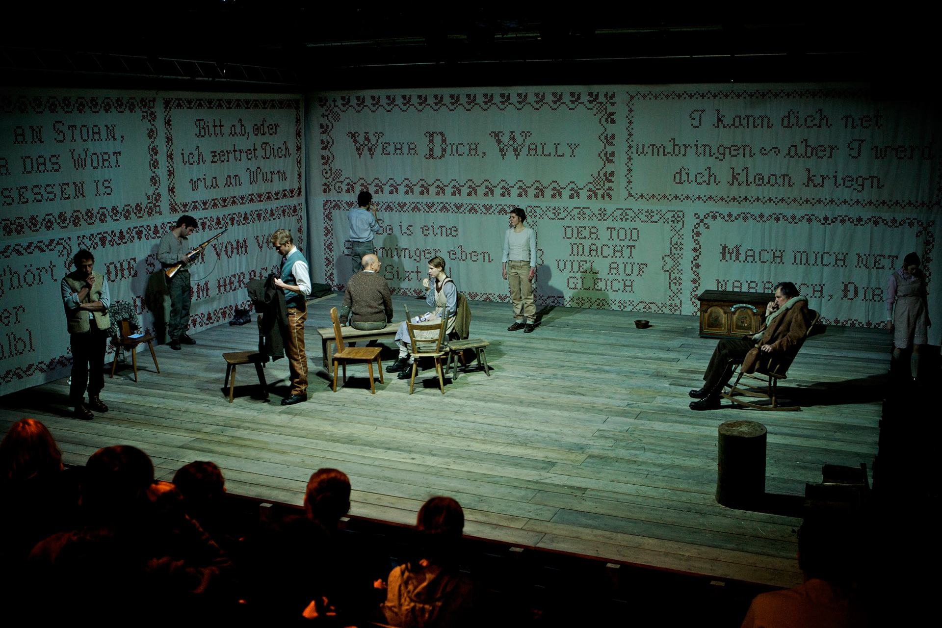 ein massiver Stubenboden - eingerahmt von überdimensionalen gestickten sinnspruchartigen Textzitaten aus dem Stück schaffen den archaischen Raum einer traditionstreuen Gesellschaft - die Regeln stehen über den Menschen, erdrücken den Lebensraum - alte Möbel weisen den Figuren ihren Platz zu
