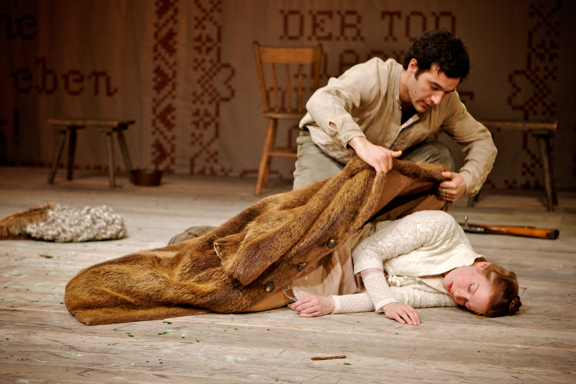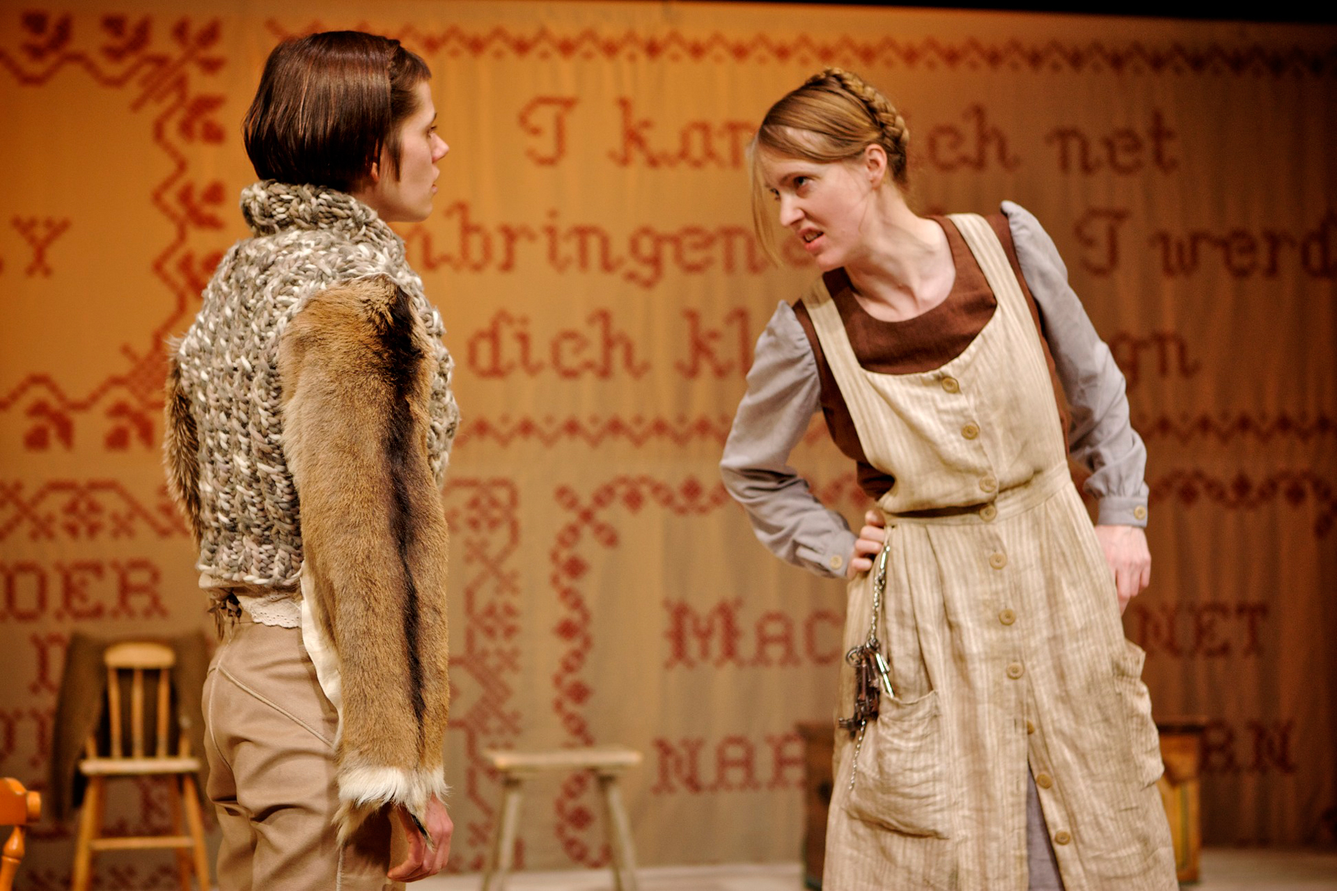 a solid living room floor – framed by oversized embroidered, aphoristic quotations from the play – creates the archaic space of a traditional society – the rules stand above people, oppressing the living space – old furniture assigns the characters their place