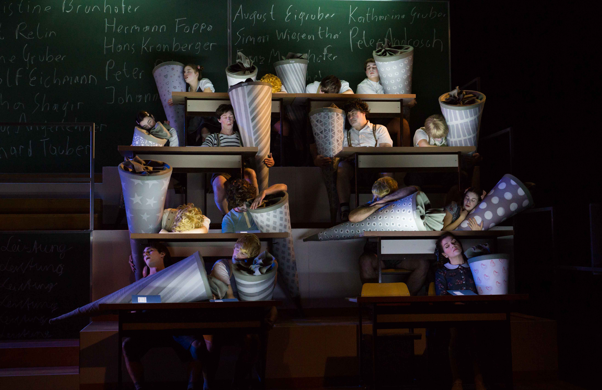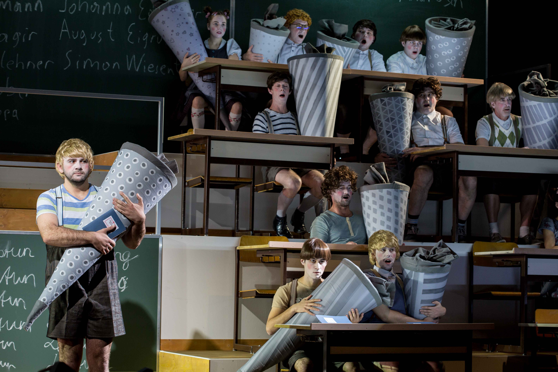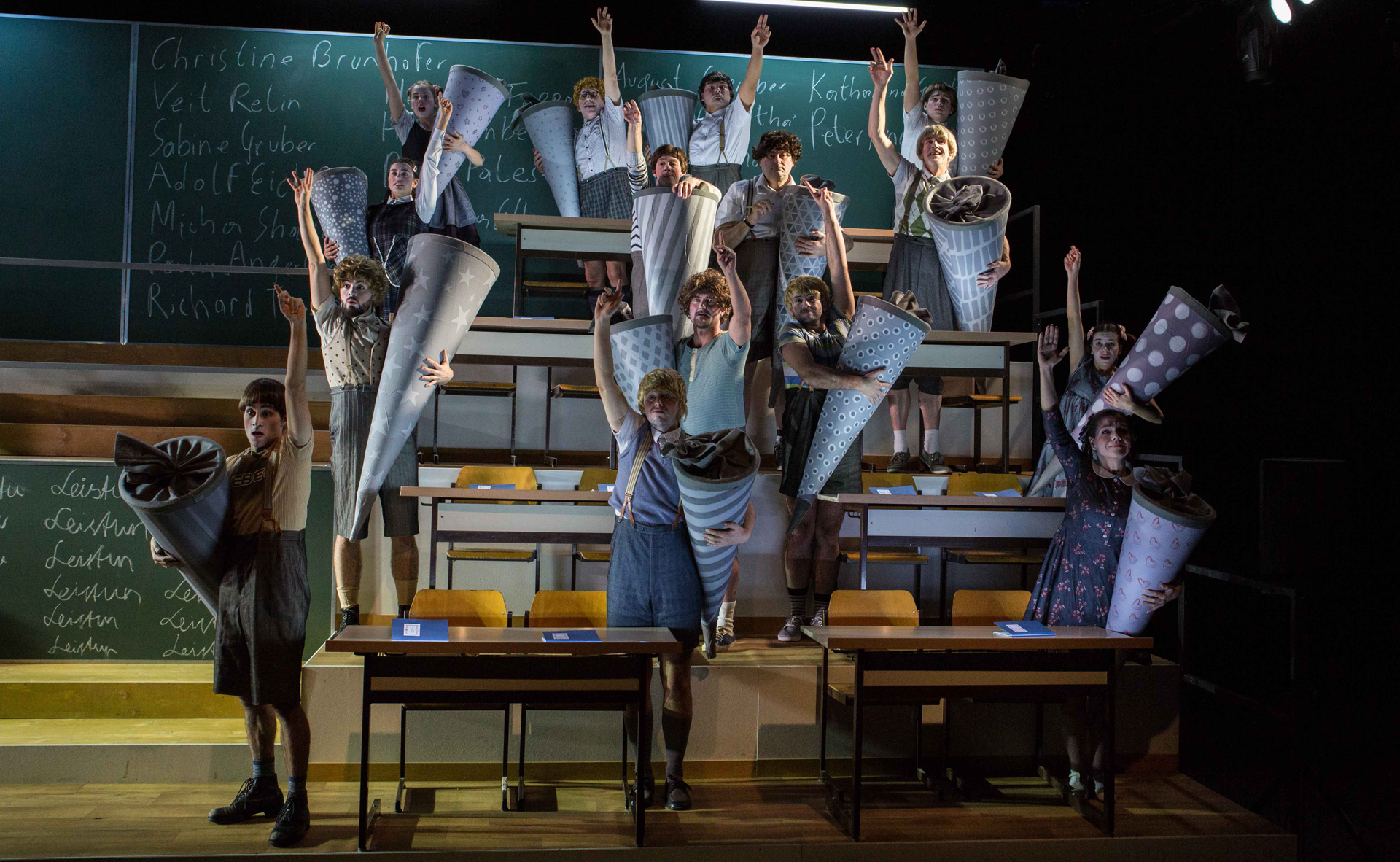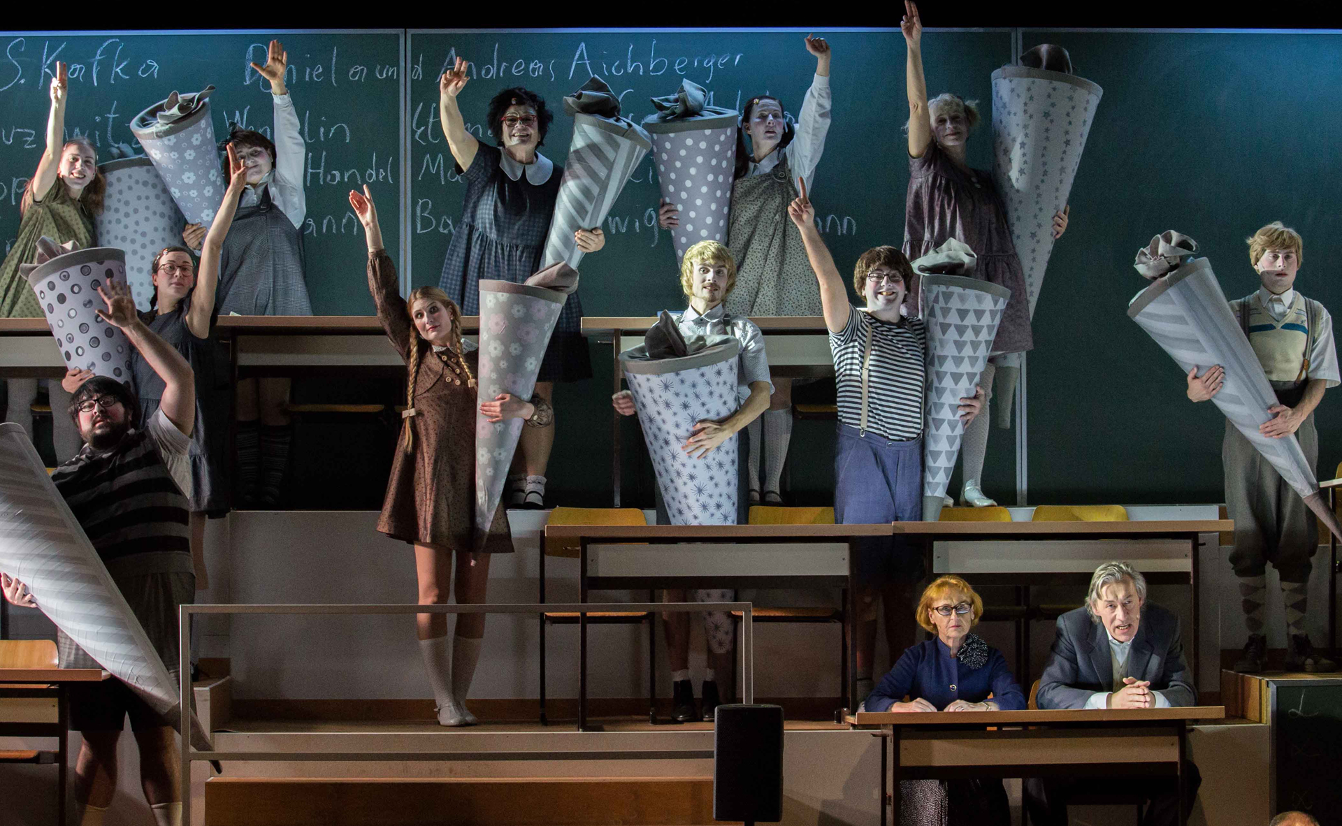 die Schüler:innen suchen Halt und klammern sich an ihren überdimensional großen Schultüten fest