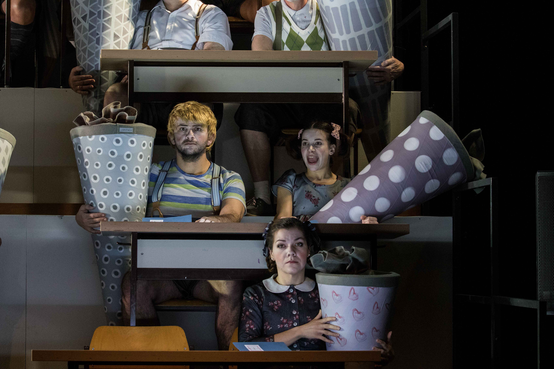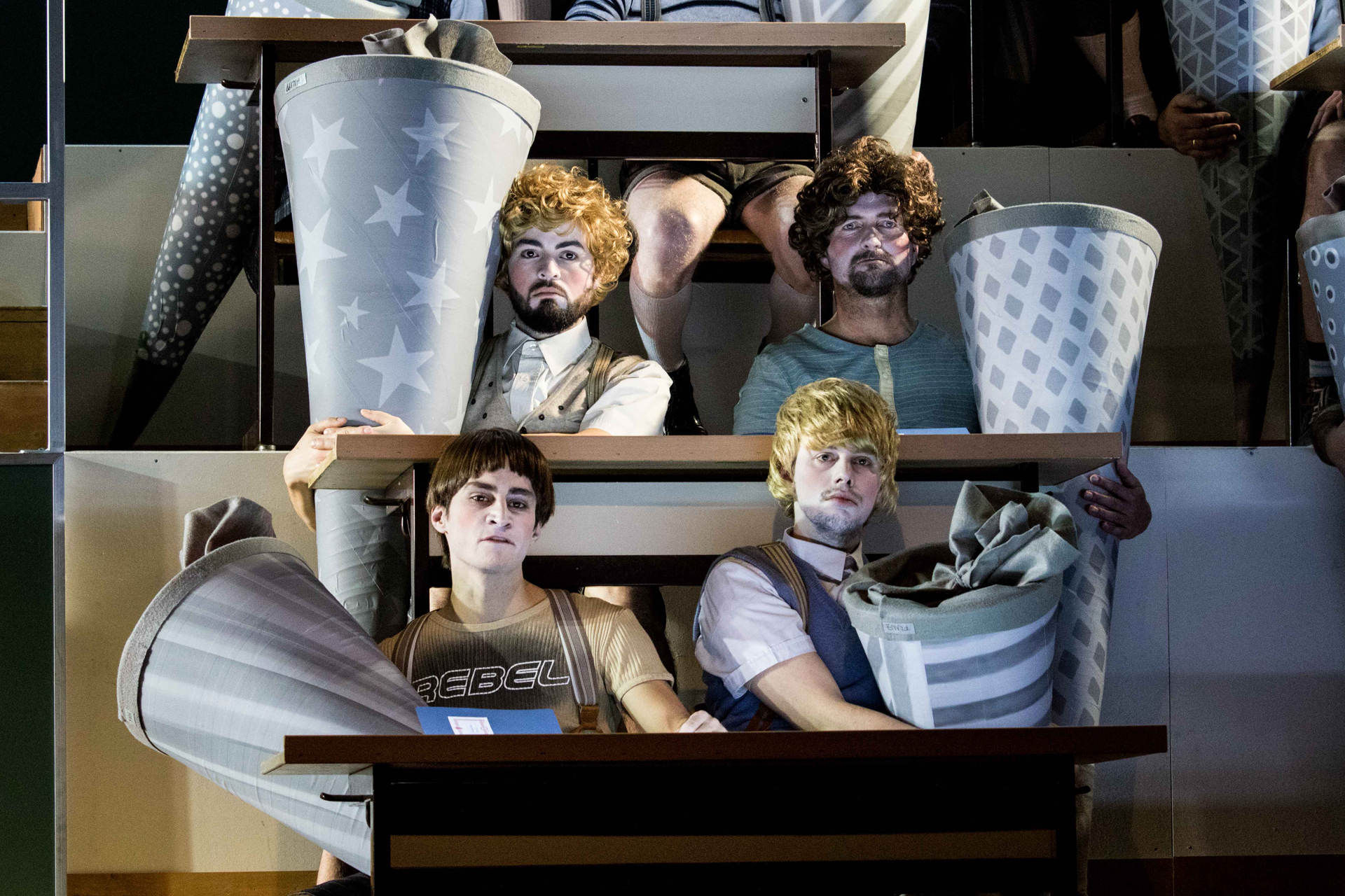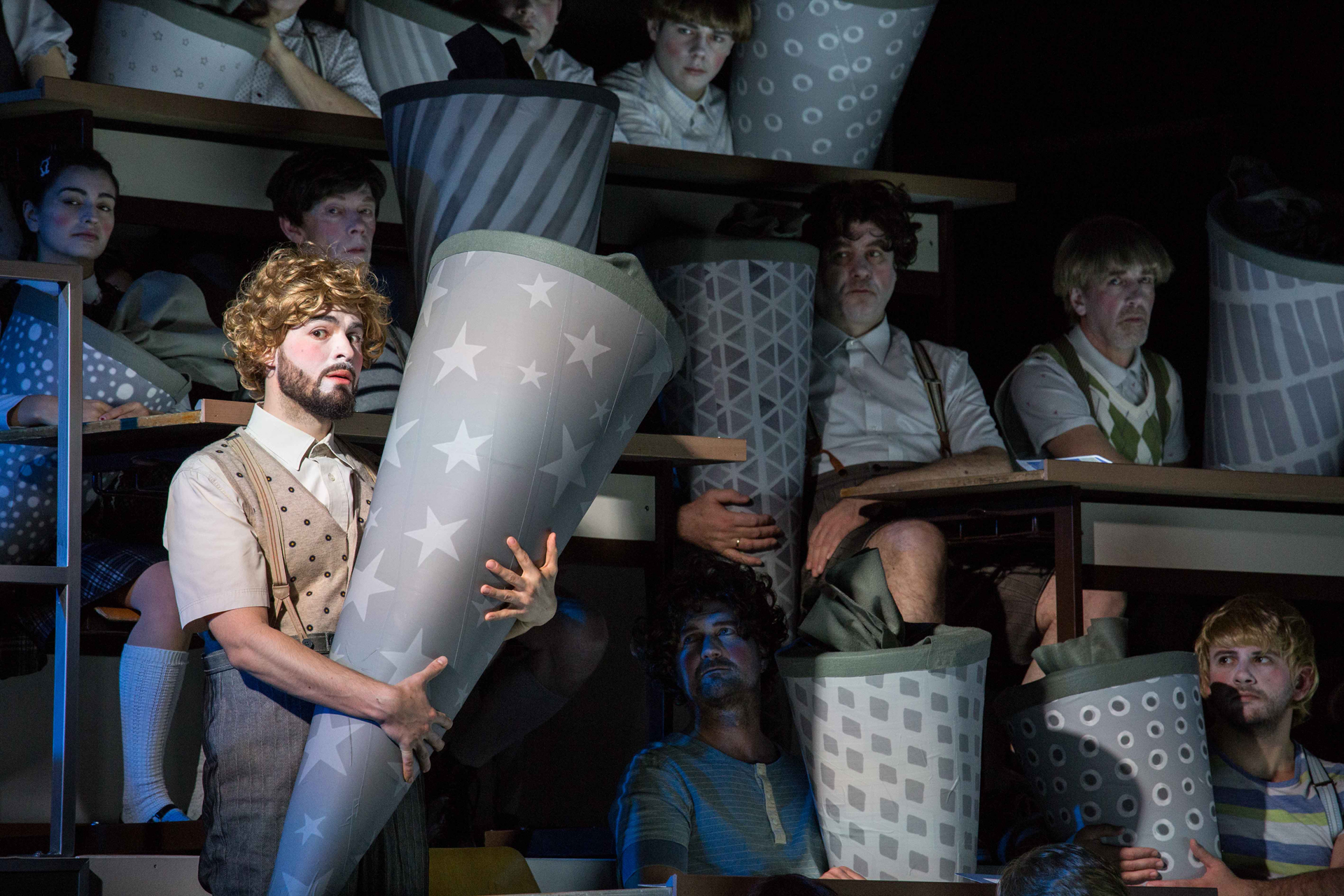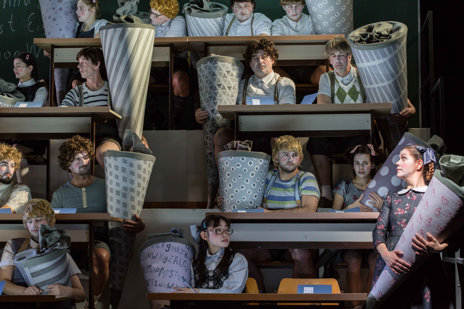die Schüler:innen suchen Halt und klammern sich an ihren überdimensional großen Schultüten fest