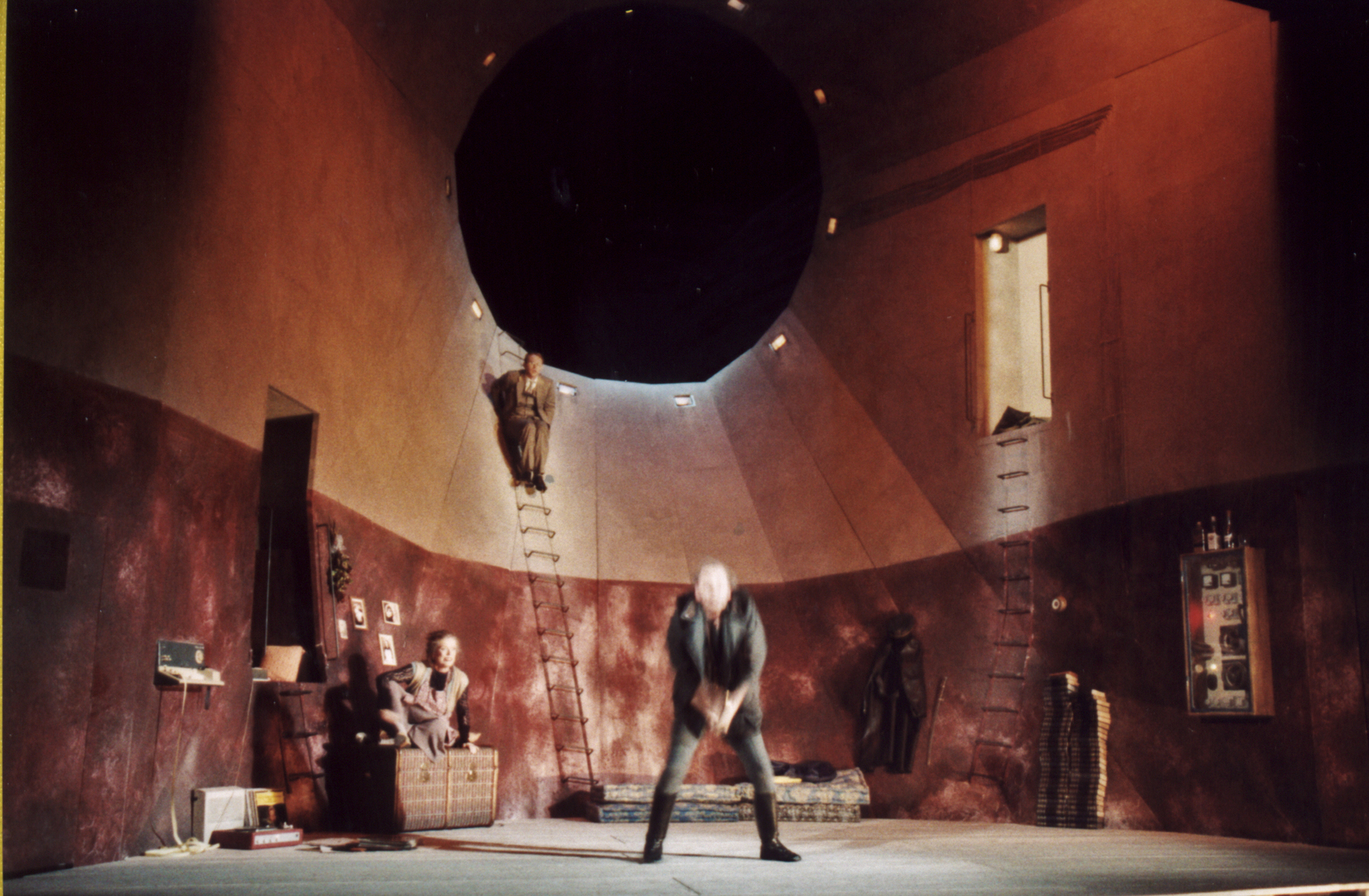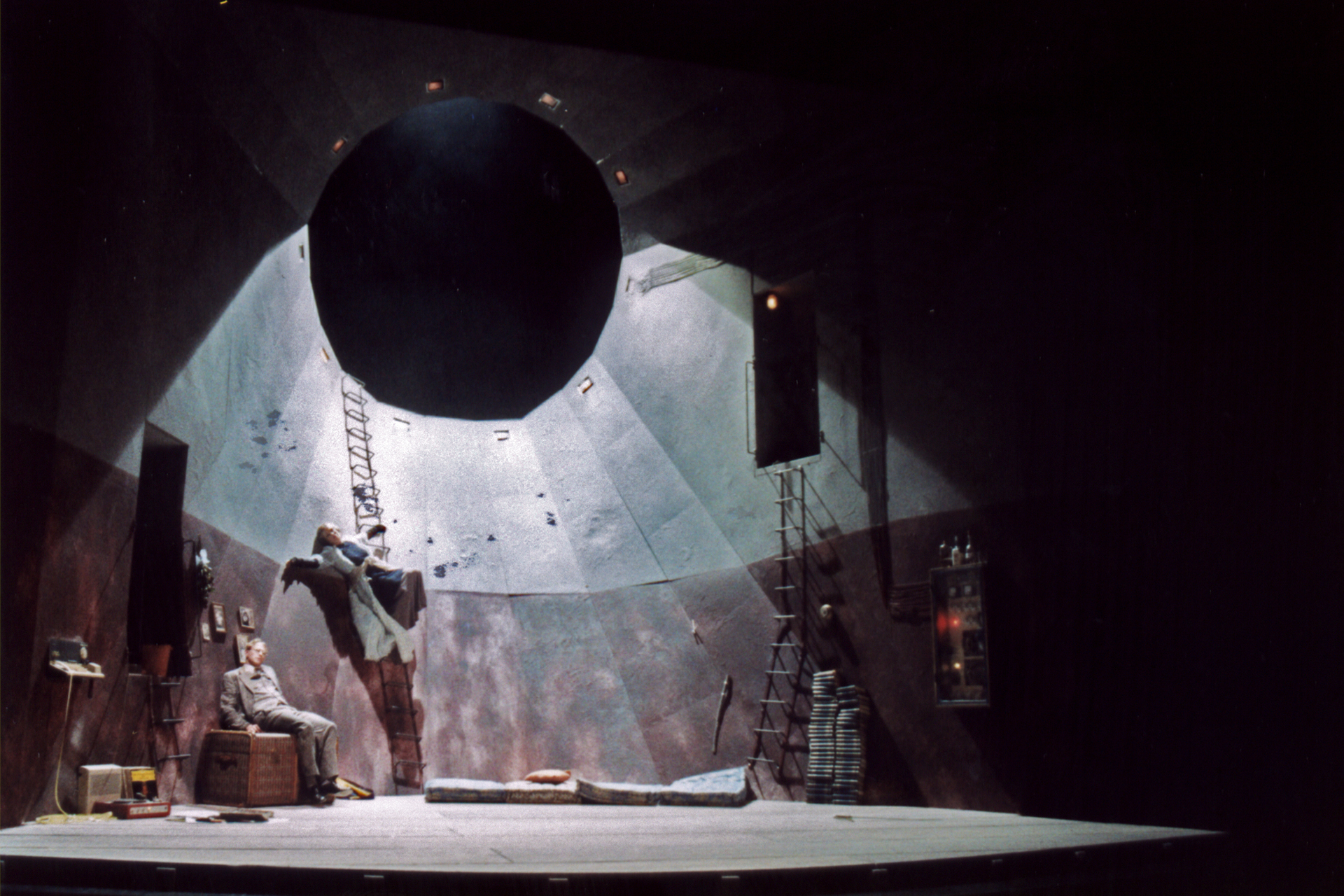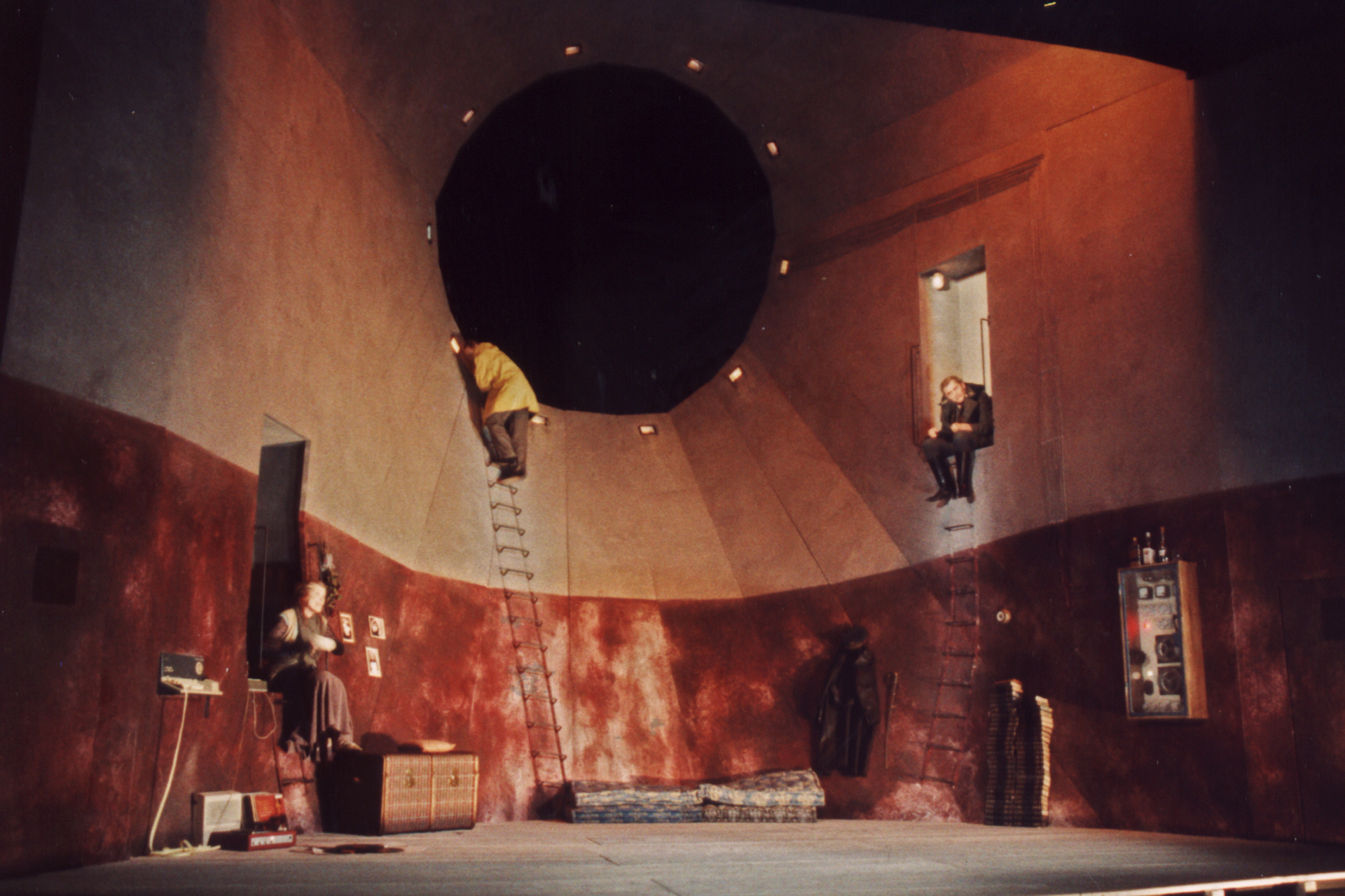 a lighthouse tilted backward and distorted – the figures sit in niches like birds in their nests – a long ladder leading to the upper opening is the only glimmer of hope for a way out of a frozen situation